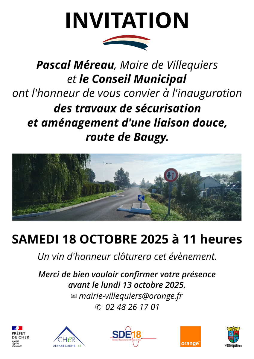 Pascal Méreau, Maire de Villequiers et le Conseil Municipal ont l'honneur de vous convier à l'inauguration des travaux de sécurisation et aménagement d'une liaison douce, route de Baugy, le samedi 18 octobre 2025 à 11h.