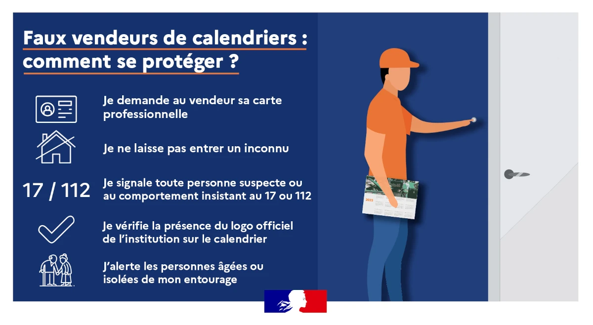 Pour vous en prémunir, quelques réflexes simples : demandez au vendeur sa carte professionnelle et assurez-vous que le logo de l’institution figure sur le calendrier.