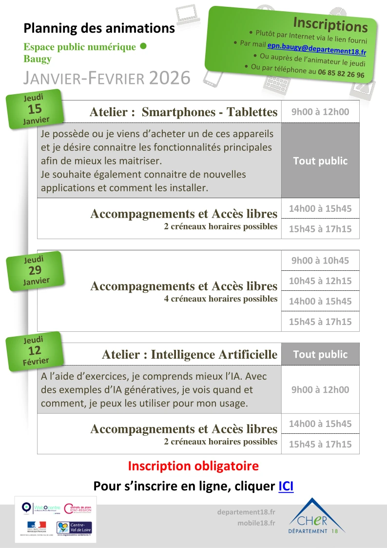 Pour toute demande d'information ou inscription, contactez l'animateur des Espaces Publics Numériques au 06 85 82 26 96. Les inscriptions aux activités sont obligatoires.