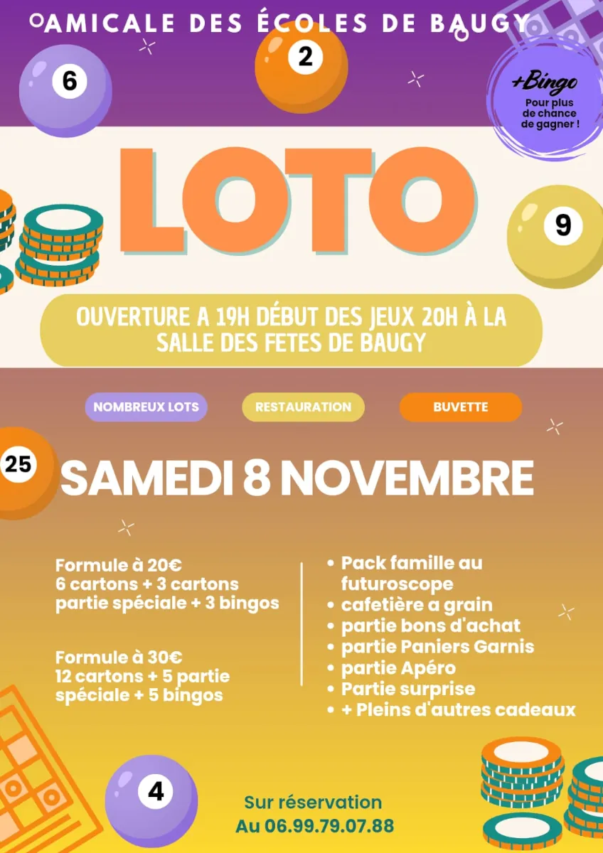 L'Amicale des Écoles de Baugy organise deux lotos, à la salle des fêtes de Baugy :