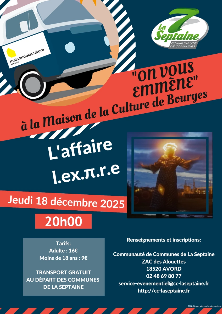La Communauté de Communes de La Septaine vous propose d'assister à la représentation « L'affaire l.ex.π.r.e », le jeudi 18 décembre 2025 à 20h00, à la Maison de la Culture de Bourges. Un transport gratuit est assuré au départ des communes de La Septaine.