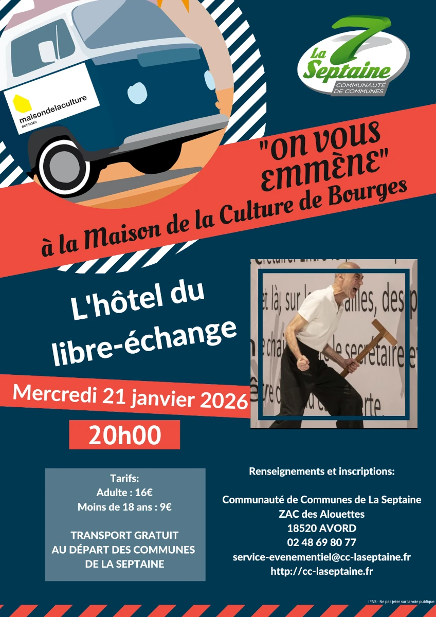 La Communauté de Communes de La Septaine vous propose d'assister à la représentation « L'Hôtel du Libre-Échange », le mercredi 21 janvier 2026 à 20h00, à la Maison de la Culture de Bourges. Un transport gratuit est assuré au départ des communes de La Septaine.