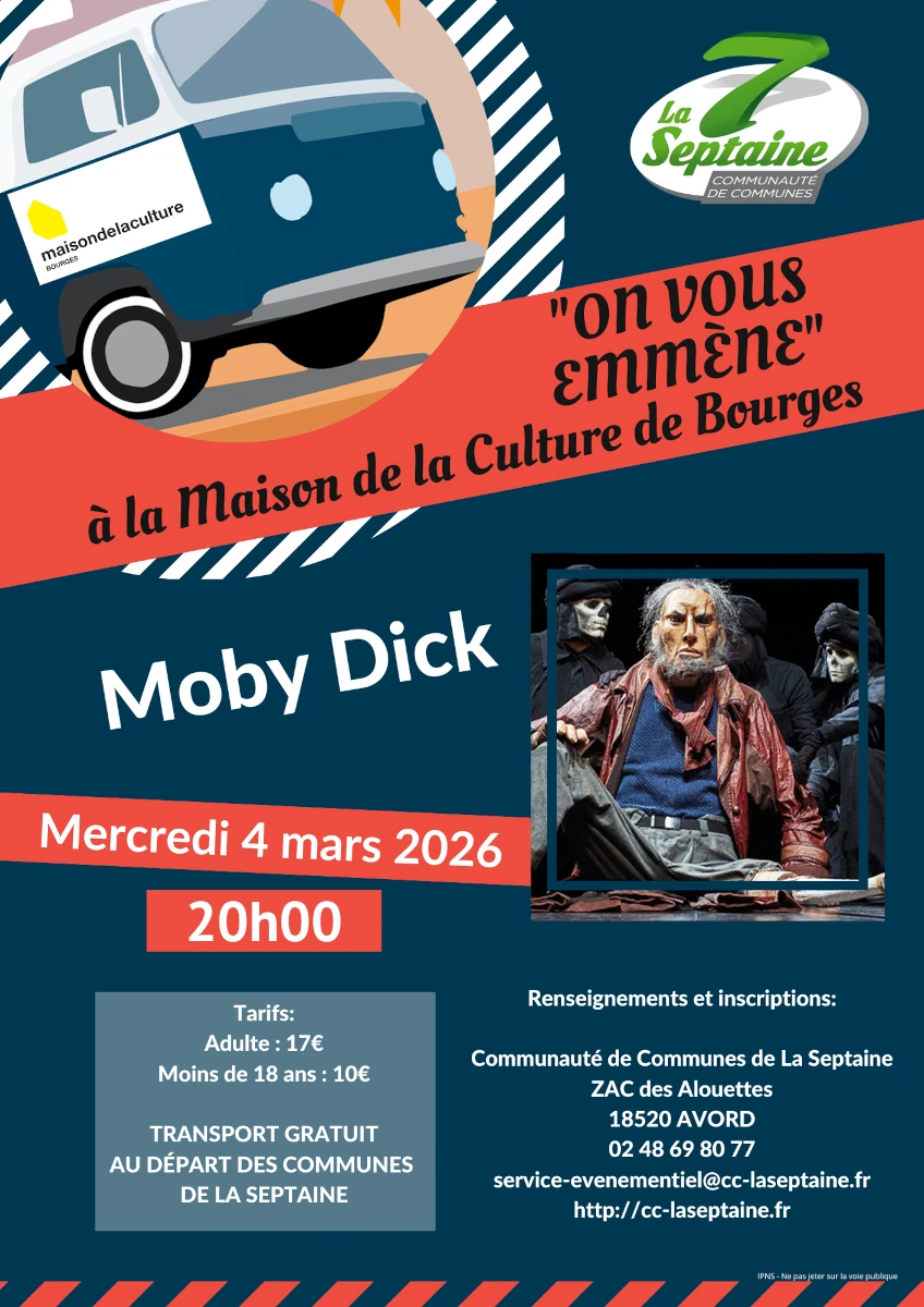 La Communauté de Communes de La Septaine vous propose d'assister à la représentation « Moby Dick », le mercredi 4 mars 2026 à 20h, à la Maison de la Culture de Bourges. Un transport gratuit est assuré au départ des communes de La Septaine.