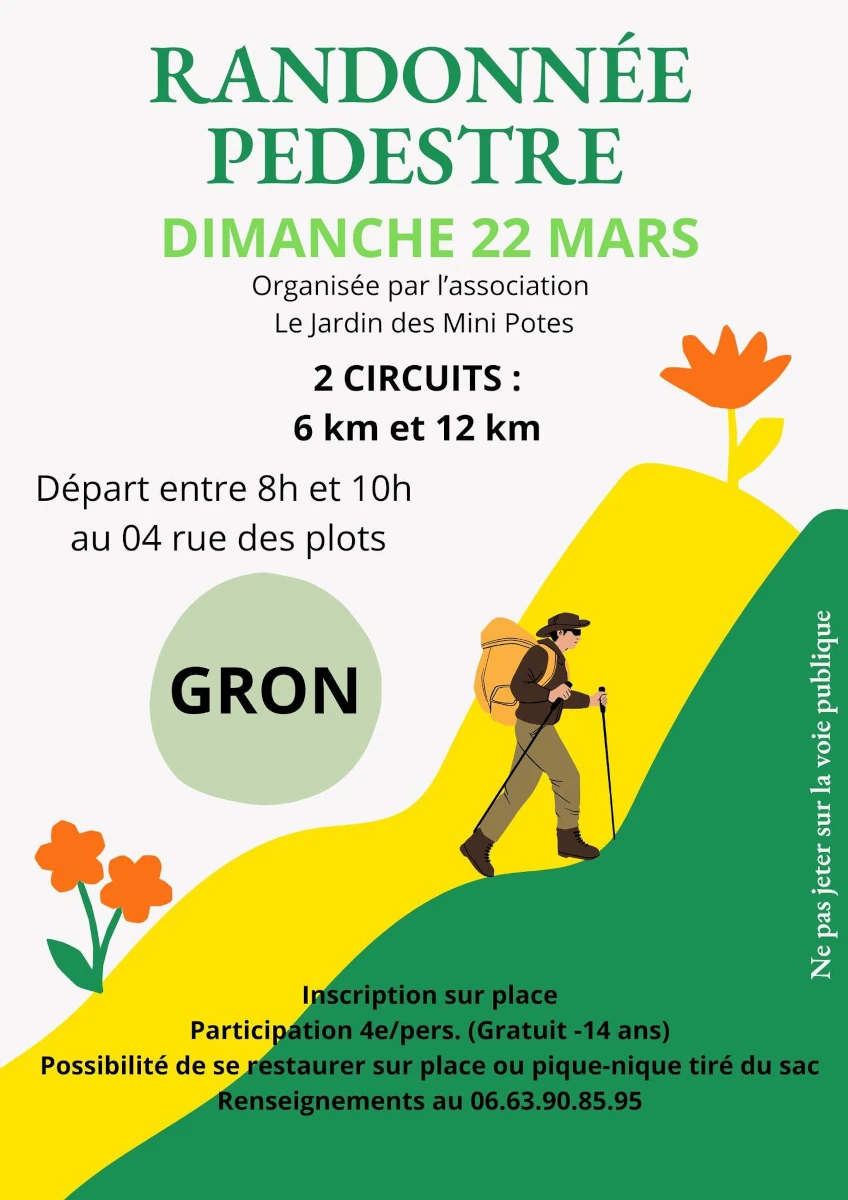 L'association « Le Jardin des Mini Potes » organise leur première randonnée pédestre, le dimanche 22 mars 2026 à partir de 8h. Venez les retrouver au 4 rue des plots à Gron.