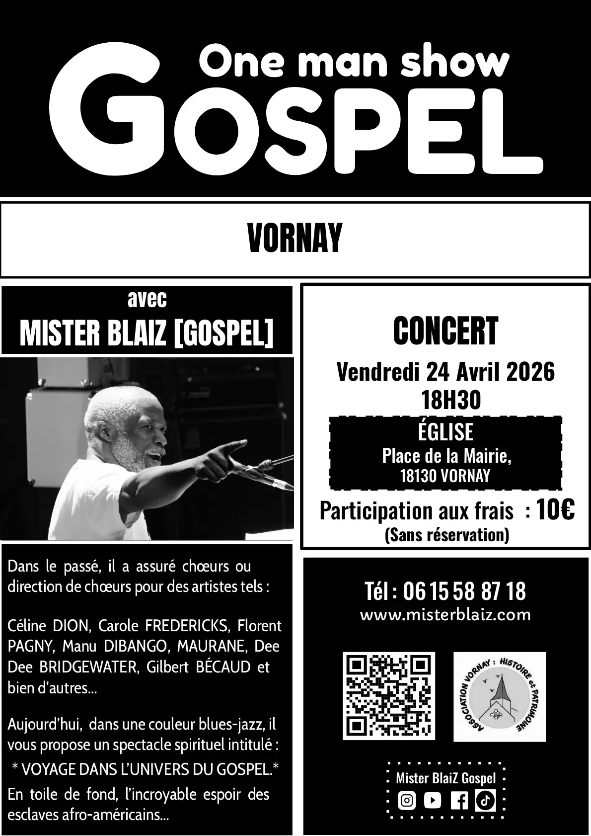 A l'initiative de l'association "Vornay Histoire et Patrimoine", Mister BlaiZ , baryton et directeur de chœurs parisien, notoirement connu pour avoir assisté des artistes de renommée internationale comme Céline Dion, Manu Dibango ou Florent Pagny, proposera un one-man-show sous la voute de l'église de Vornay, édifice roman à l'acoustique particulièrement adaptée.